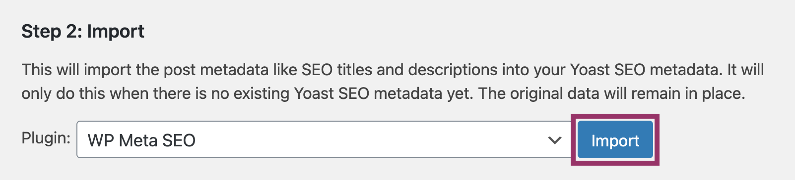 - Since you should have already created the backup, move on to importing your data from WP Meta SEO by clicking the Import button.