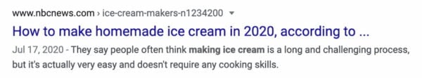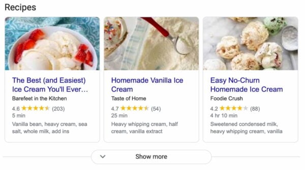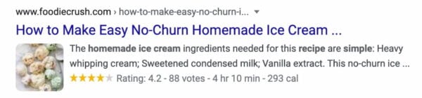 In this snippet, a picture of the ice cream is added, you can see the rating of the recipe, the time it takes to prepare this type of ice cream and the number of calories it contains. So it contains much more information than the normal snippet does. And that’s why we call it a rich snippet.