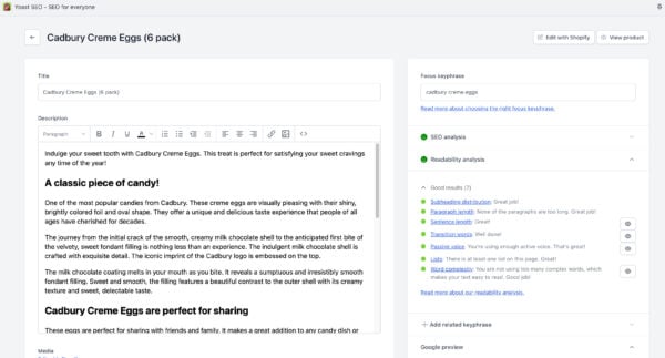 Yoast SEO for Shopify helps you write awesome product descriptions that serve both customers and search engines