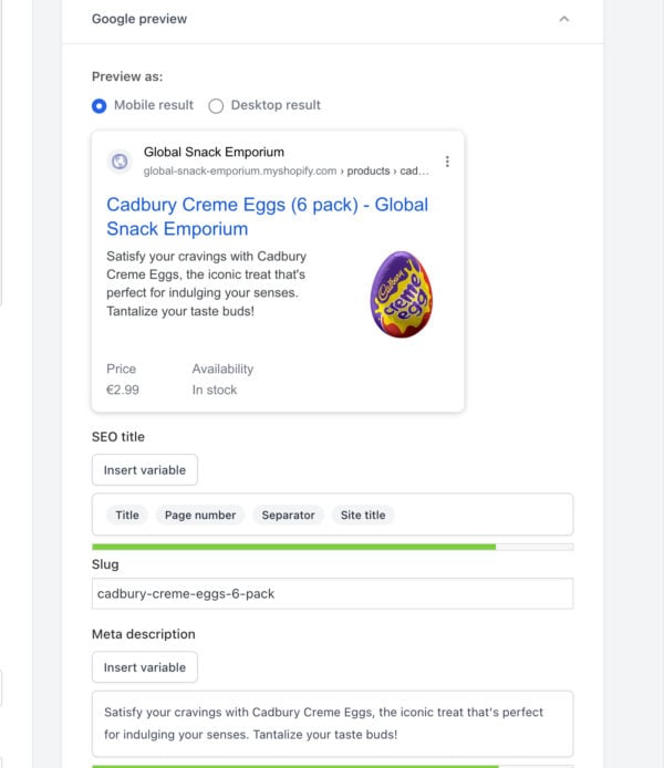You can edit these in Shopify, but Yoast SEO for Shopify makes this process much more manageable. This SEO app comes with the incredible power of variables. Using variables, you can automatically generate part of the title and the meta description based on your settings. Of course, it’s always better to write both yourself, but this allows you to automate some parts, which can be helpful when you have many products.
