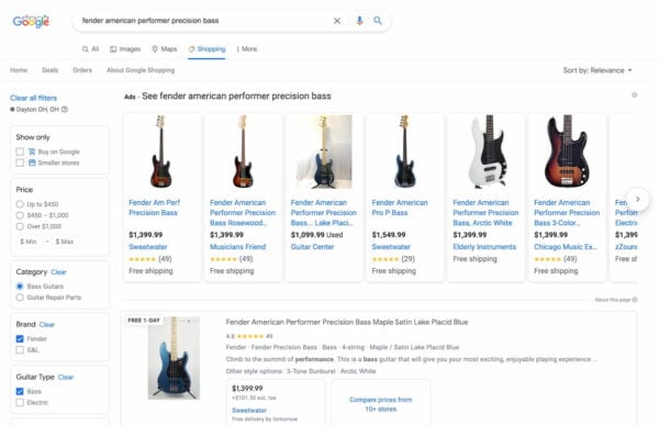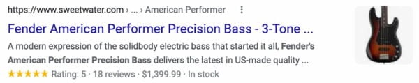 With product structured data, you can describe your product to search engines. You’ll tell them about the product’s name, description, images, SKUs, prices, reviews, etc. Search engines like Google might give your product listings a rich result in return for this valuable information. A rich result is a highlighted search with price information, availability, and even star reviews. Getting this is essential for online shops.