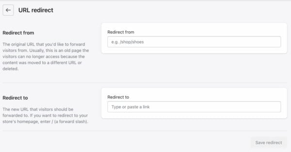 Shopify has a redirect feature built-in. For one, Shopify automatically adds a redirect when you change the slug of an existing post. You can upload CSV files with your redirects if you need to do large-scale work on your site. Or use the URL redirect feature in the navigation section of the admin settings. It’s a straightforward redirect feature with just two fields: one for the old URL you want to redirect and one for the new URL you want to old one to point to.