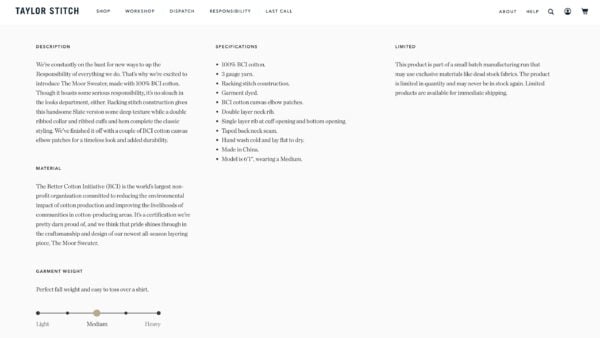 Taylor Stitch gives you everything you need to know about a product on one screen