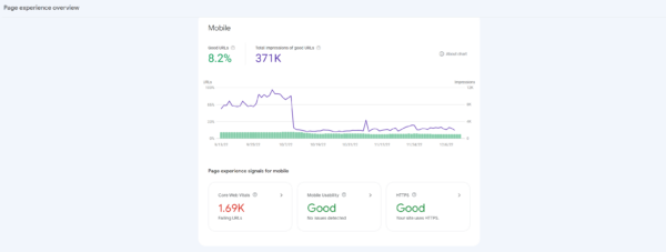 To see this report, go to Google Search Console and look for “Page experience” in the left navigation bar. You should see an overview of how your mobile and desktop pages perform.