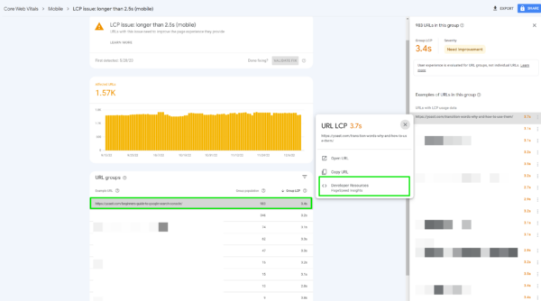 Clicking on one of these groups will show you the full list of URLs on your right bar. And if you click on an URL, a box will appear with a link that takes you to an audit of the page on PageSpeed Insights.
