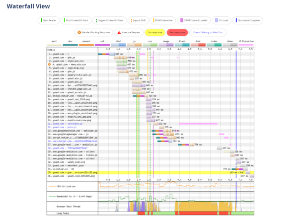 An interesting feature of this tool is the “waterfall” view. Essentially, it presents you with an overview of how much time it takes for all the assets on a page to load. This can be especially useful if you want detailed diagnostics to identify optimization opportunities.
