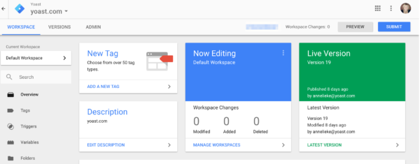 After you’ve inserted the Google Tag Manager code to your pages, you’re ready to create your own tags. This can be done in a so called workspace that looks like this: