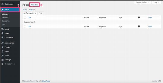 The Post editing screen will open. Note: the Post editing screen may appear slightly different, depending on the theme you’re using. See 2 in the image.