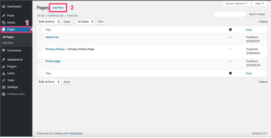 - Click on the Pages menu item in the admin menu (1 in the image)