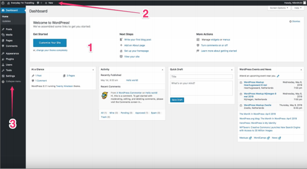 This takes you to a screen like the image below, where you see the WordPress Dashboard (1), the admin toolbar (2), and the admin menu (3).