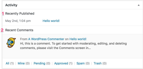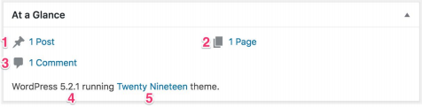As the name already implies, the At a Glance widget offers an ‘at-a-glance’ look at your site’s posts, pages, comments, and theme. As you can see in the image, it shows you the number of current posts (1), pages (2), and comments (3). It also shows you what version of WordPress you’re running (4) and which theme is active on your webpage (5).
