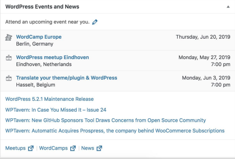 Finally, in the WordPress Events and News widgets, you are offered a quick glimpse of what’s happening in the WordPress world. It shows an overview of WordPress-related news and upcoming WordPress events, like Meetups and WordCamps.