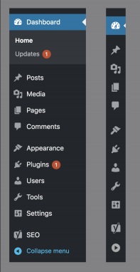 The admin menu is the sidebar on the left side of your screen. As shown in the image below, you can view the admin menu expanded or collapsed. The admin menu consists of various menu items. In this lesson, we’ll go into the default menu items of the admin menu. Please note that if you have any plugins installed, there may be extra, plugin-specific, items in your admin menu. For example, in the image below, you’ll see the menu item of the Yoast SEO plugin at the bottom of the list.