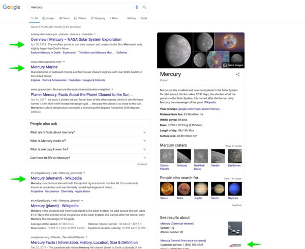 In many cases, people use the same term to look for very different things. For example, take the search term [Mercury]. Some people will be looking for the planet, others for the element, even others for the Roman god of commerce, and a few might be looking for the lead singer of the band Queen. This one word can be used to describe several distinctly different things – also described as entities. The context makes clear which entity a word is referring to. It’s important to be aware of how this works in search engines, so we wrote a post about entities and semantics that can help you with that.