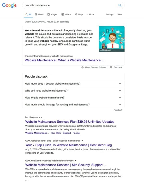 Here at Yoast, we write about all aspects of SEO. One of those aspects is keeping your website in good shape. We had an article planned on this topic, and one of the most important terms we used in this article was ‘Website maintenance’. Our article was about keeping your site content fresh and your site’s structure well-maintained in the process. However, when we started looking at the SERPs, we noticed that wasn’t what people were looking for at all when they used that term. The content in the answer box wasn’t really related, and the other results almost exclusively consisted of companies offering services to work on technical site maintenance and hosting, with some results stressing the importance of this.