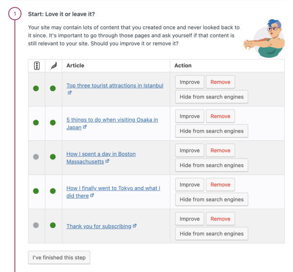 To help you clean up your old content, we’ve created an SEO workout that identifies your pages and posts that don’t have any links and walks you through four simple steps to fix them. These steps allow you to decide whether you want to update or delete a certain page: love it or leave it. And when you do decide to update it, it also suggests pages or posts from which you can link to this updated content. Helping you fix your orphaned content and update it at the same time!