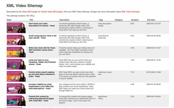An example of a XML video sitemap for yoast.com, generated by Yoast Video SEO