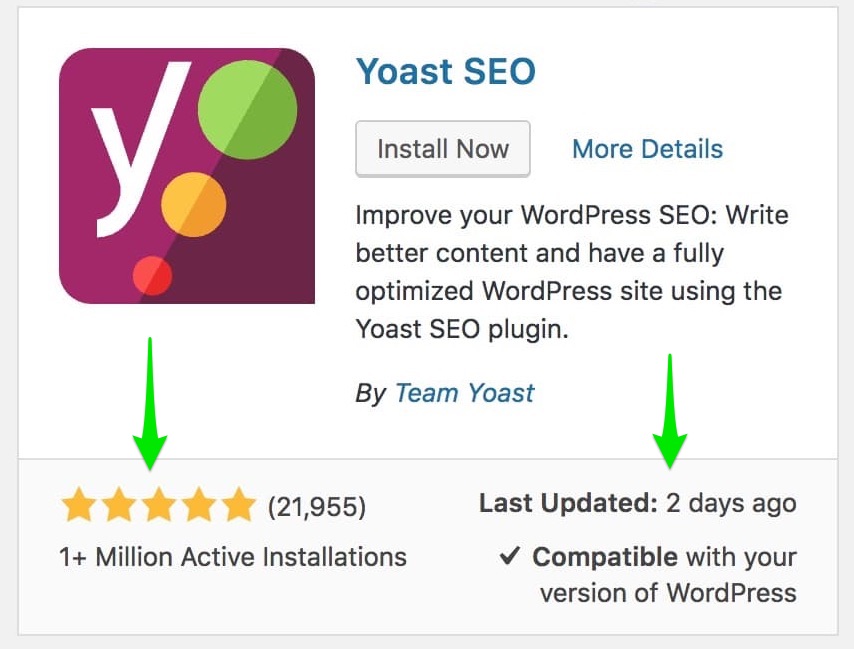 Each plugin is featured in a box with basic information. A good quality plugin will have good reviews, a high number of active installations, frequent updates, and it will be compatible with your version of WordPress.