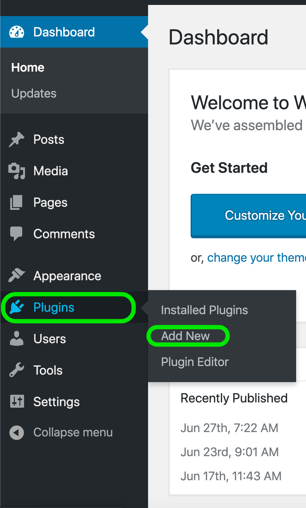 Access the WordPress plugin directory In your site’s backend, go to the admin menu. Hover over the Plugins menu item, and select. Add New from the fly-out menu. The WordPress plugin directory will appear.