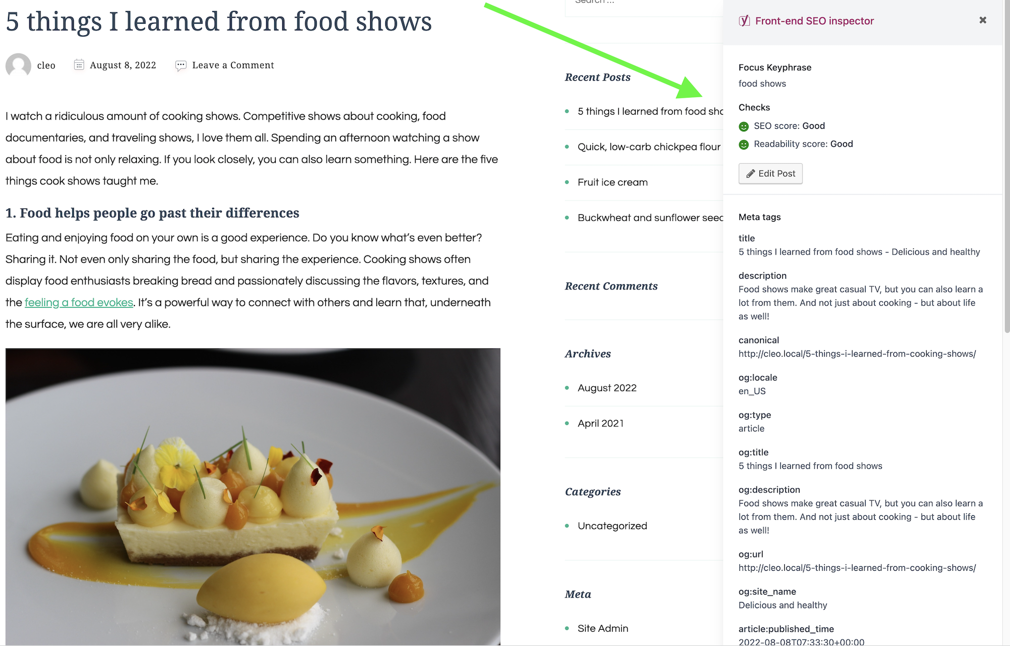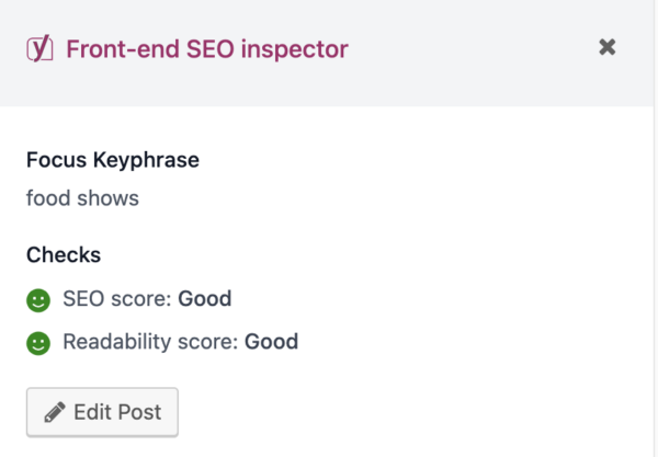 At the top of the front-end SEO inspector, you’ll see the SEO and readability scores of the page. See any red or orange bullets? Then, it’s a good idea to click the Edit post button, check the Yoast SEO feedback and see if you can turn those bullets green! That will ensure your pages are well optimized for your readers and search engines.