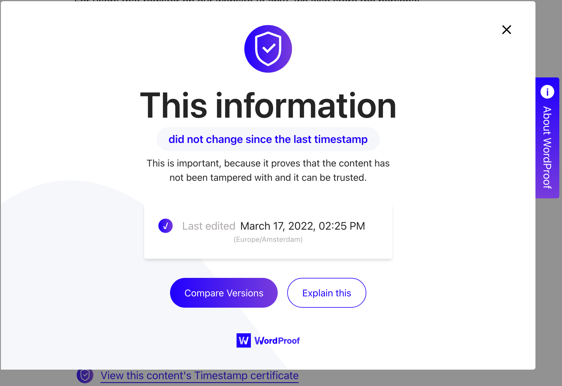 WordProof adds the hash to a blockchain transaction, after which it can’t be altered or removed. This hash, stored in a blockchain, is a timestamp. You can see the timestamp as a certificate of birth for your content. With this unique hash, timestamped on a blockchain, you can prove to people, search engines, and social media platforms that you didn’t tamper with your content.