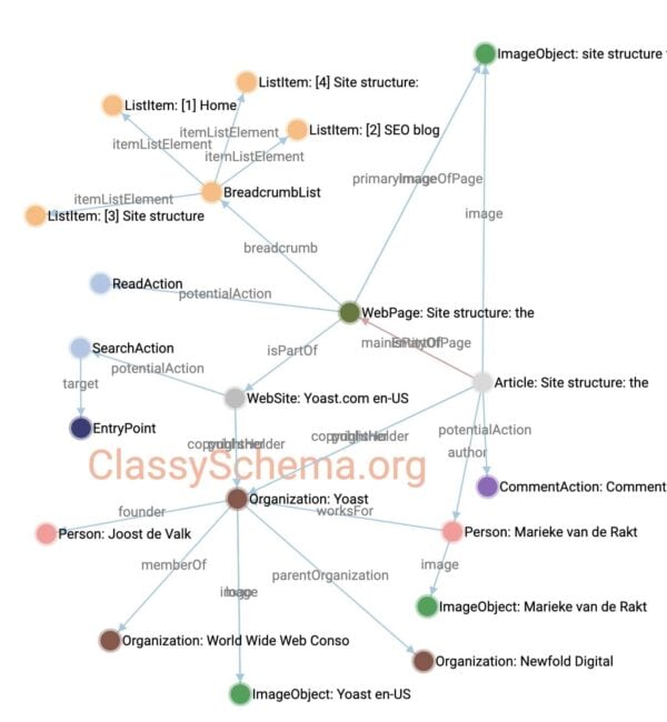 As you can see, the site structure post is an Article written by me, Marieke van de Rakt, who works for the Organization Yoast (founded by Joost de Valk and part of Newfold Digital). The WebSite of Yoast is yoast.com. You can even see in the BreadcrumbList where this article can be found on the website (Home → SEO Blog → Site Structure tag). Additionally, you can see how the images on the page relate to other items: my avatar is connected to me, the featured image is related to the blog post, and so forth.