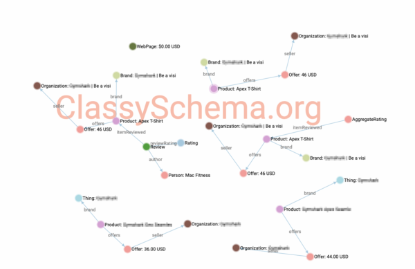 This is the schema of a random product page that we ran through the same tool. As you can see, there are a lot of free-floating fragments. Clearly, the product is an Apex T-Shirt, but how is it related to all the other Apex T-Shirts? Is the schema tool outputting the same product schema multiple times? Or are the products related to the main product but is the relation unclear?