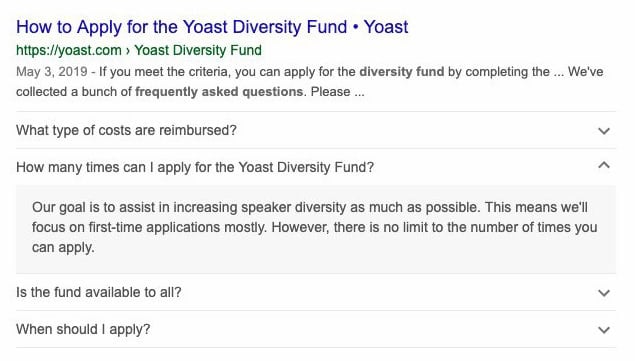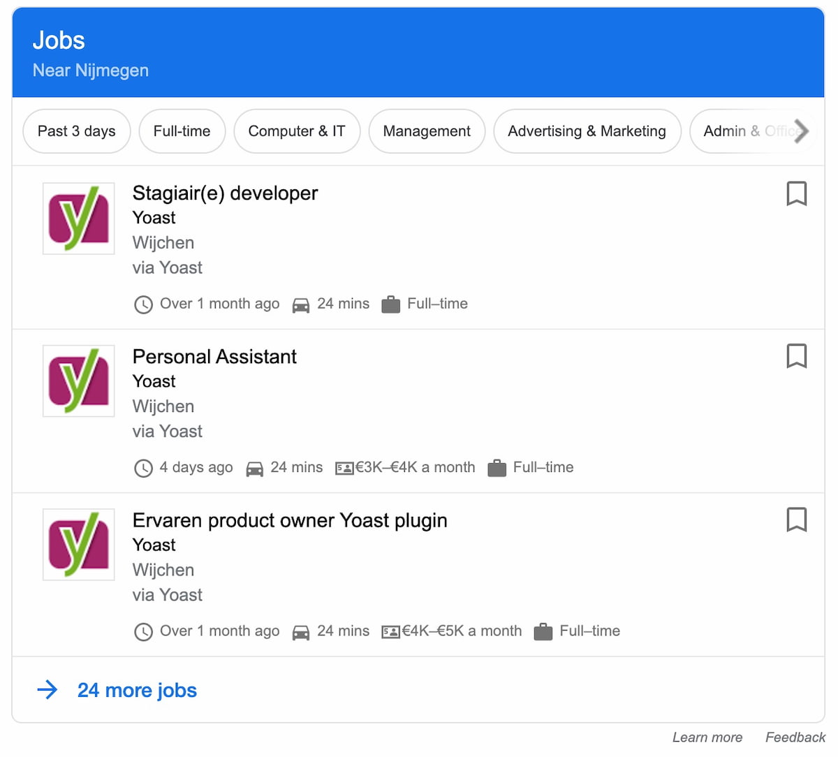 Google Jobs has been around for a while and recently even launched in the country where Yoast HQ is located: The Netherlands. We’ve made sure that our job postings follow Googles guidelines for adding structured data to jobs. Using JobPosting Schema helps Google make sense of the job offers and that makes it possible for them to show the result like the one you see below. Google has more information on how to add this for your jobs.