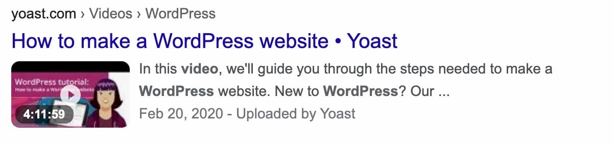 Videos show up in search results in several different ways these days. Your videos can show up in the regular search results, the video results or the images results. In addition, Google also has various rich results with video like the one for home activities. If you describe your videos with Schema using the VideoObject, you can get Google to understand important facts about the video which helps them show it properly. If video plays an important role on your site, our Video SEO plugin can help get all the information ready for Google.