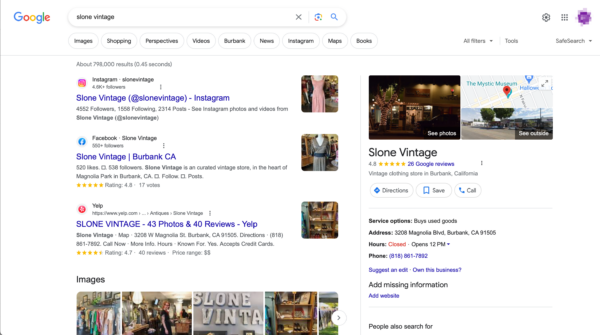 To clarify how this works, we will use a real local business: Unique Vintage in Burbank, CA. This makes it a bit easier to validate the data we enter. In the code below, you’ll find all the NAP details, URLs, geolocation data, and opening hours you might need.