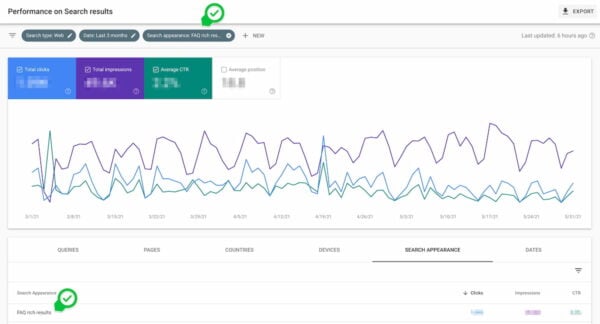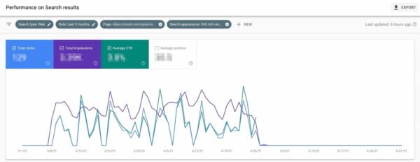 You’ll notice the total clicks, impressions, CTR, and average position of your FAQs. This way, you’ll get a sense of how this type of content is performing on your site, and you get a rough idea of the way people are interacting with it.