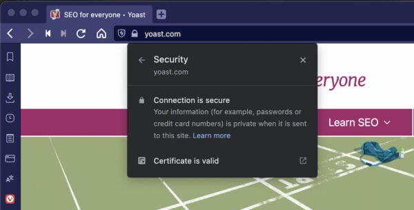 Sites that list these security seals also come with a nice lock icon in the address bar of your browser. Did you know you can actually click the lock icon for more information on a website’s security? It’s pretty similar per browser, but here’s what it could tell you about yoast.com: