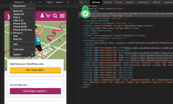 You can also test your mobile site straight from your browser. In your Chrome browser, simply visit your own website and right-click somewhere on the browser screen. Click ‘Inspect’. You can also open it from the menu bar Tools > Developer Tools. After that, click the second icon in the inspector’s menu bar: