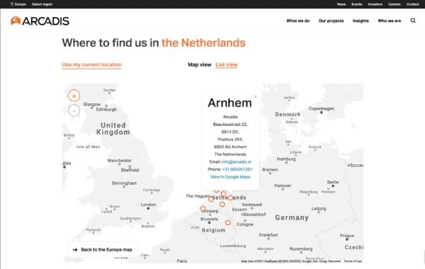 Arcadis makes great us of maps to locate offices worldwide, of course, there’s also a list view
