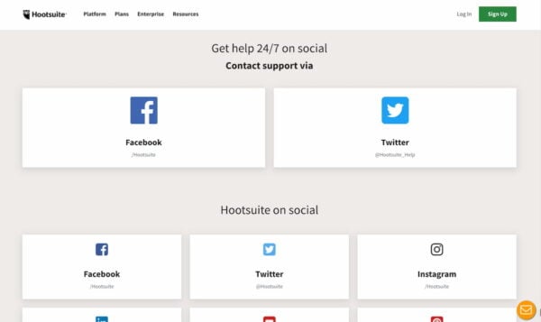 Social media is a very common way to stay in touch with (potential) customers and some customer services have made an art out of helping customers that way. Be sure to list your active social networks on your website. And make sure to respond to any (serious) mention of your company or direct message you receive. Hootsuite, for instance, being a social media company, has a nice section on theirs that contains all their social networks. Of course, they emphasize the option to use these to get in contact with them.
