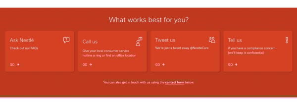 Nestlé gives you a number of options to choose from, being Ask Nestlé, Call us, Tweet us and Tell us. We like that concept as well, although there is no one call-to-action standing out from the rest, so we’re not sure what will work best. Another example, on the ABN AMRO contact page you’ll notice a yellow CTA that invites you to call them.