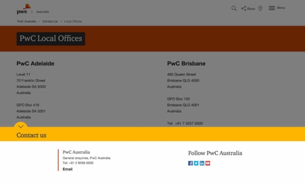 PwC Australia lists all local offices on a single page, plus a sticky footer has details for the headquarters