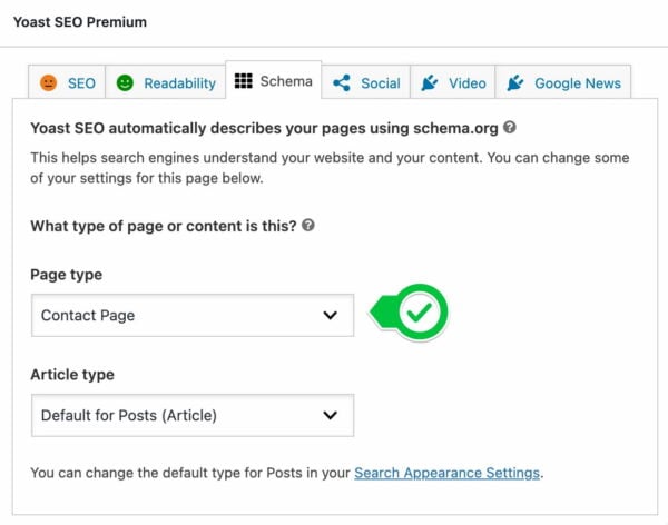Chances are you are running Yoast SEO on your site, of course. If you haven’t done so, you should go to your contact page and set the correct page type in the Schema tab to Contact Page. By doing this, you describe to search engines that the particular page they are now reading is really a contact page.