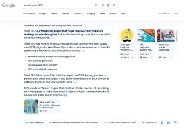 Google initiated the Search Generative Experience (SGE) to improve users’ search experience and develop the future of search. For this, Google uses generative AI to provide quick and concise overviews of search topics to enhance the search results. Or, as Google says, “We’re testing new ways to get more done right from Search.”