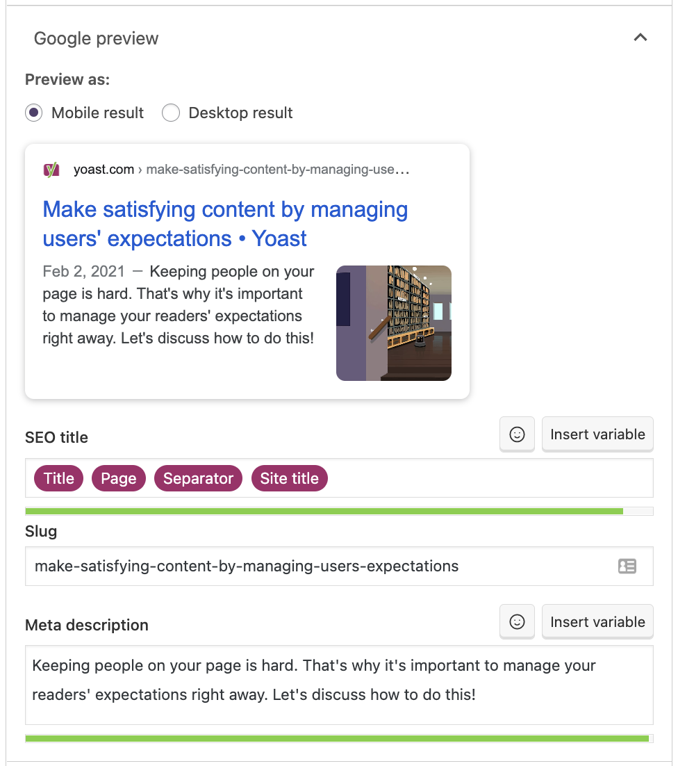 The SEO analysis in Yoast SEO also gives you feedback on your SEO title and headings. This helps you stay focused on the main topic of your text, making sure that readers instantly know what that part of your text is about. Using headings to boost the readability of your text this way helps you manage the expectations of your readers.