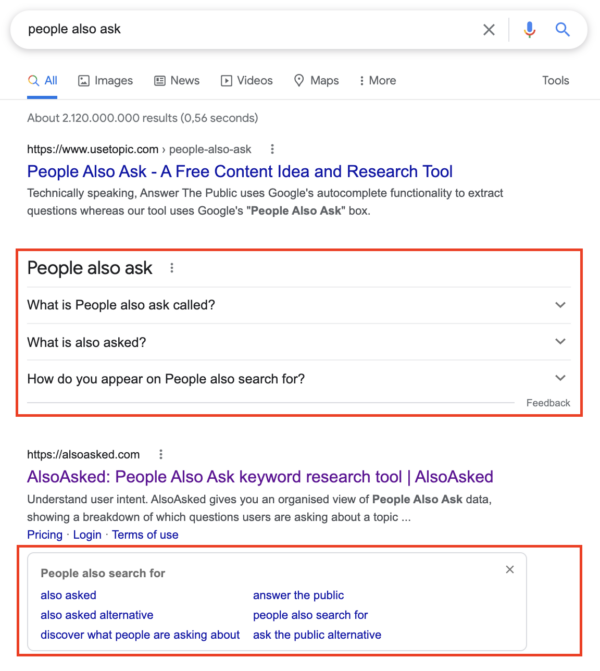 Google often shows information about what ‘People also ask’ and what ‘People also search for’ in the search results