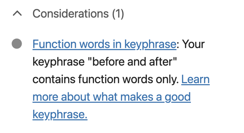 To ensure you optimize your post for a meaningful keyphrase, Yoast SEO checks whether your focus keyphrase consists of function words only. The plugin will show a grey bullet along with a warning message if this is the case.
